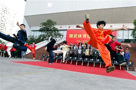 Young martial arts enthusiasts show off some spectacular high-flying moves at the opening ceremony of the Chin Woo Gymnasium in Hongkou District Monday. (Gao Jianping)